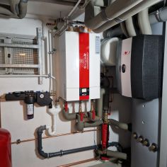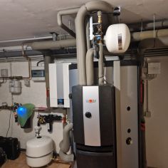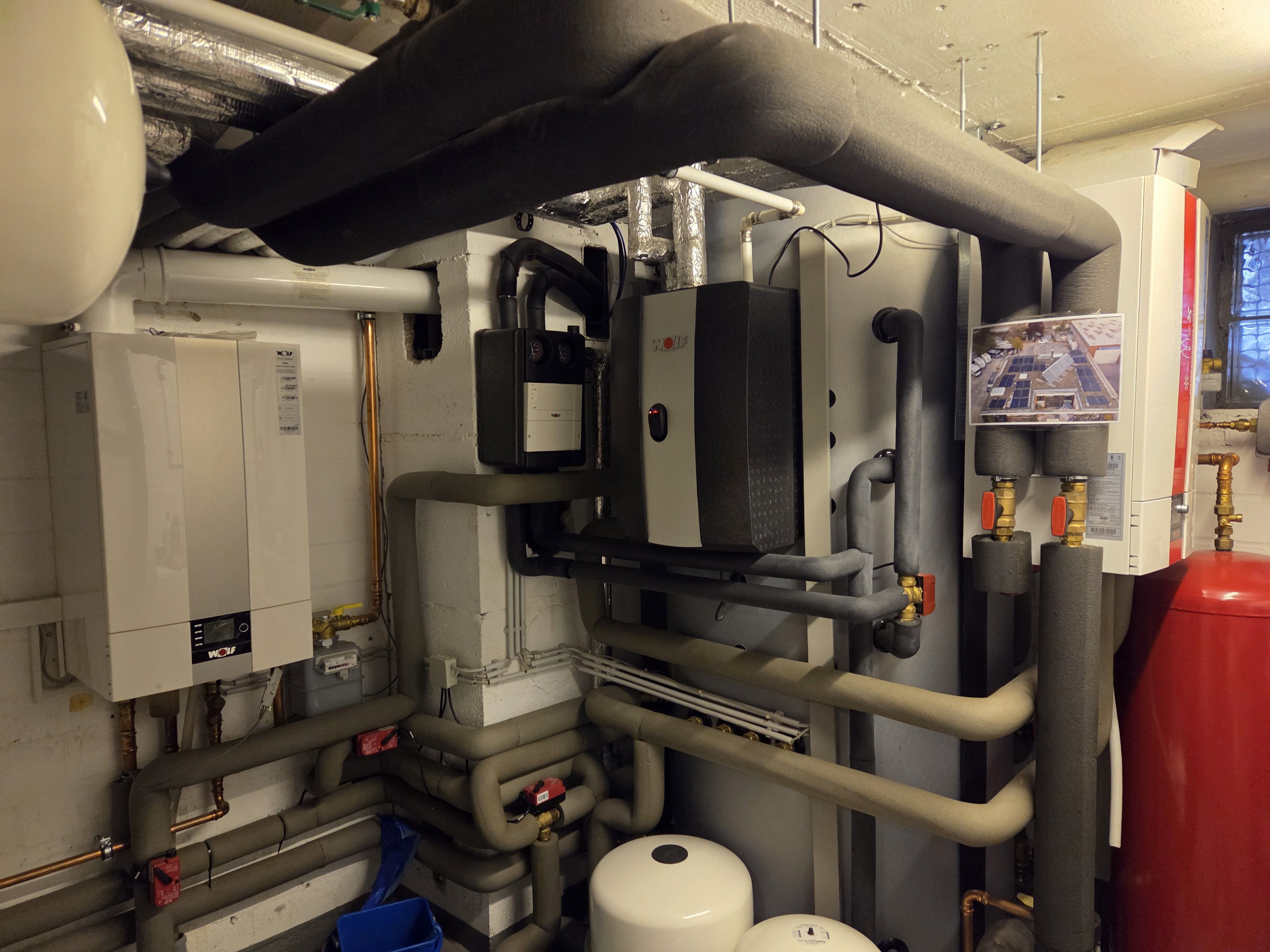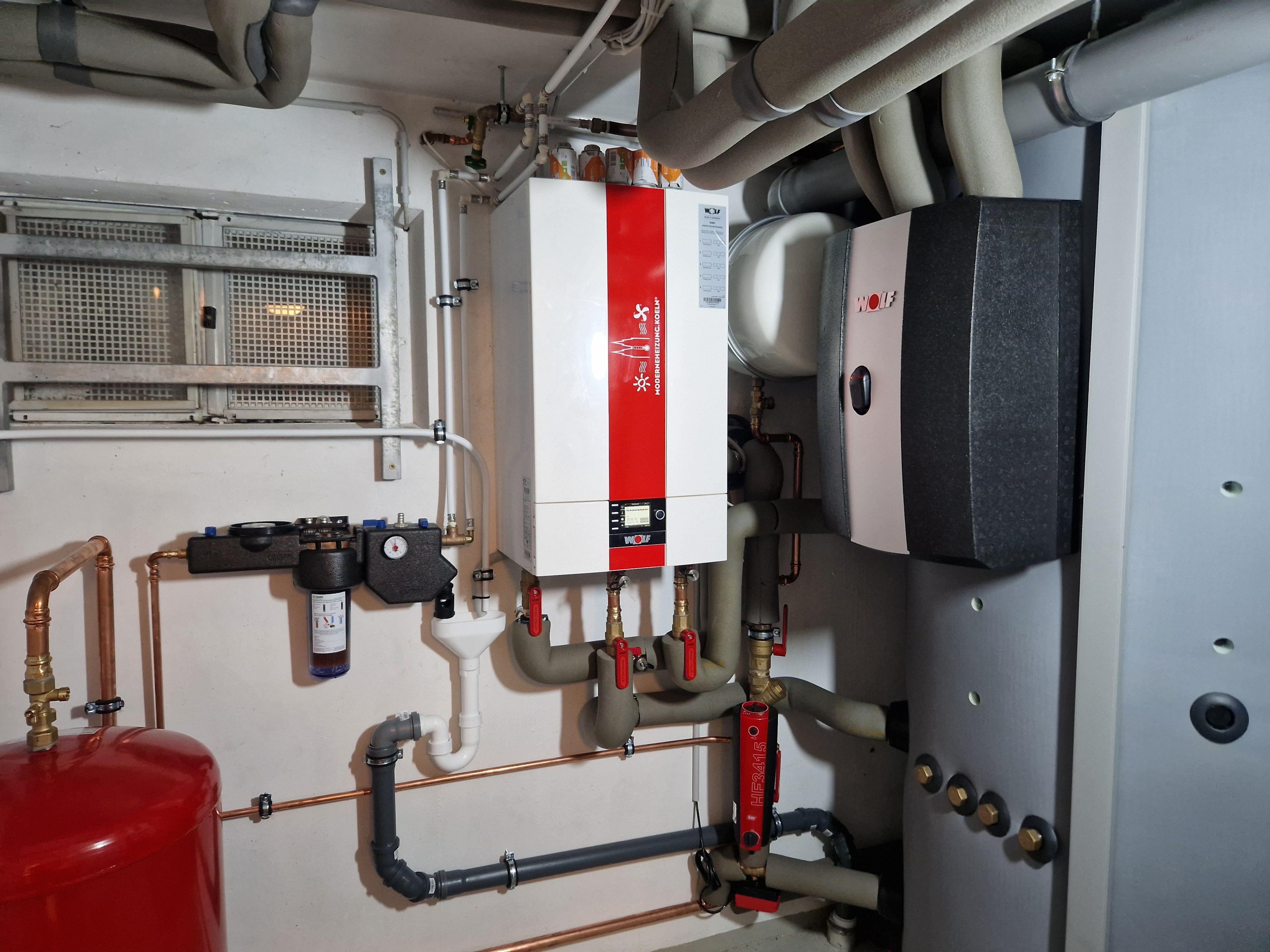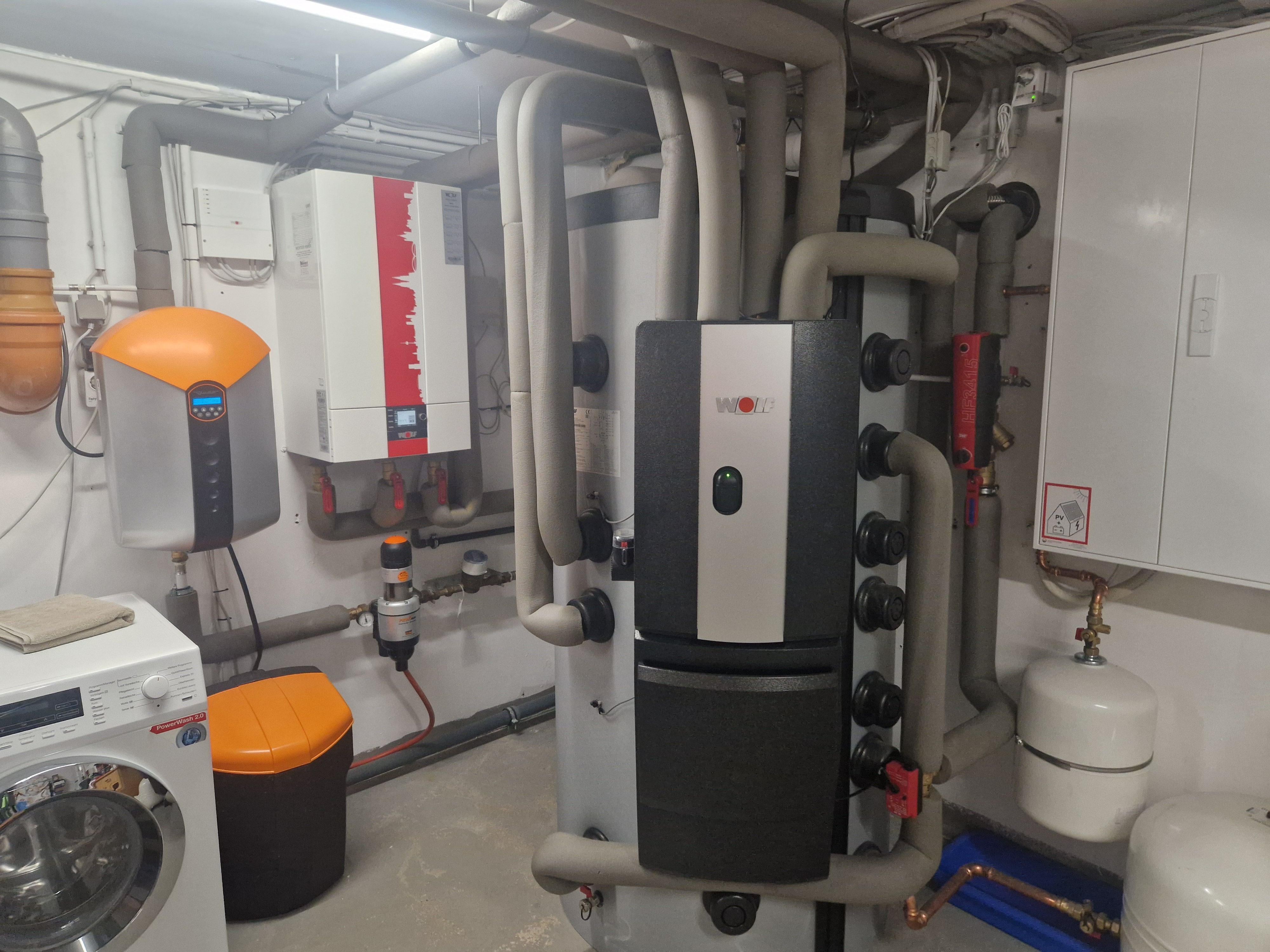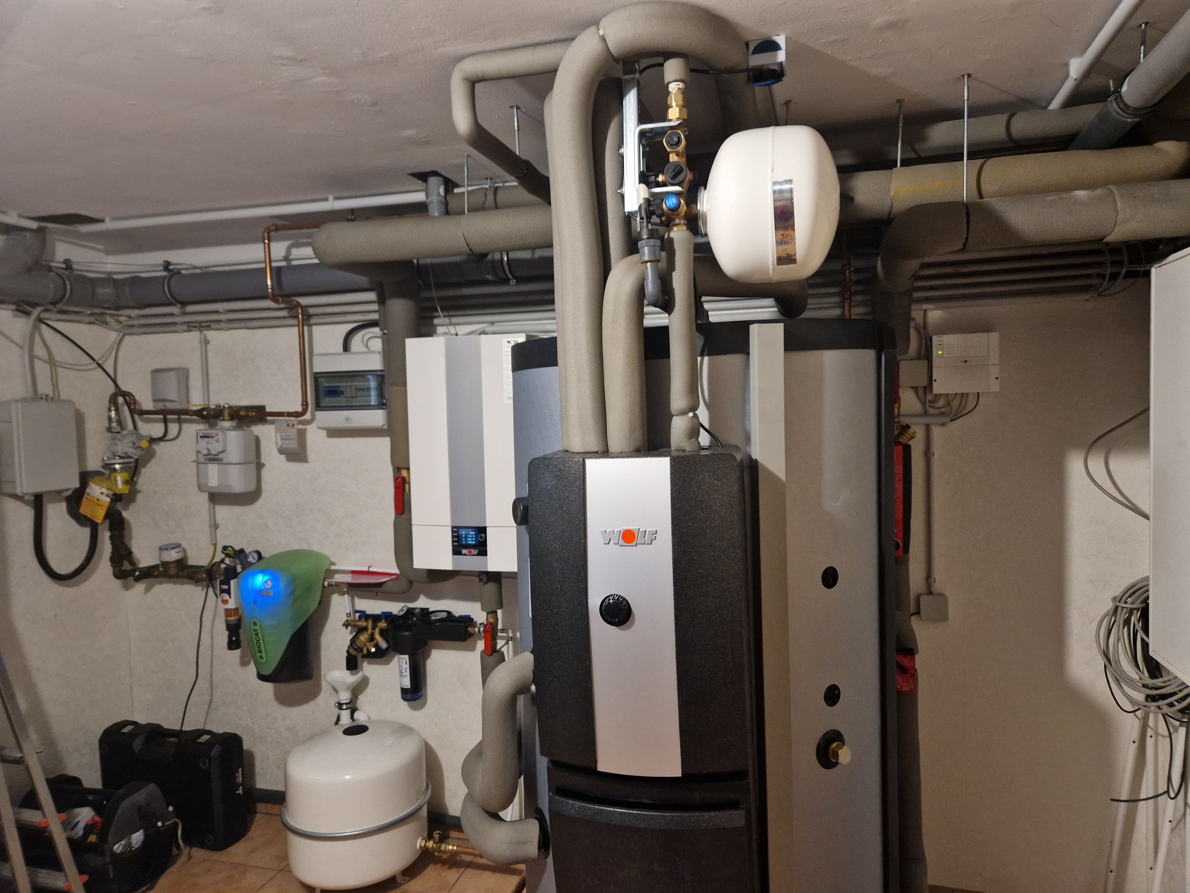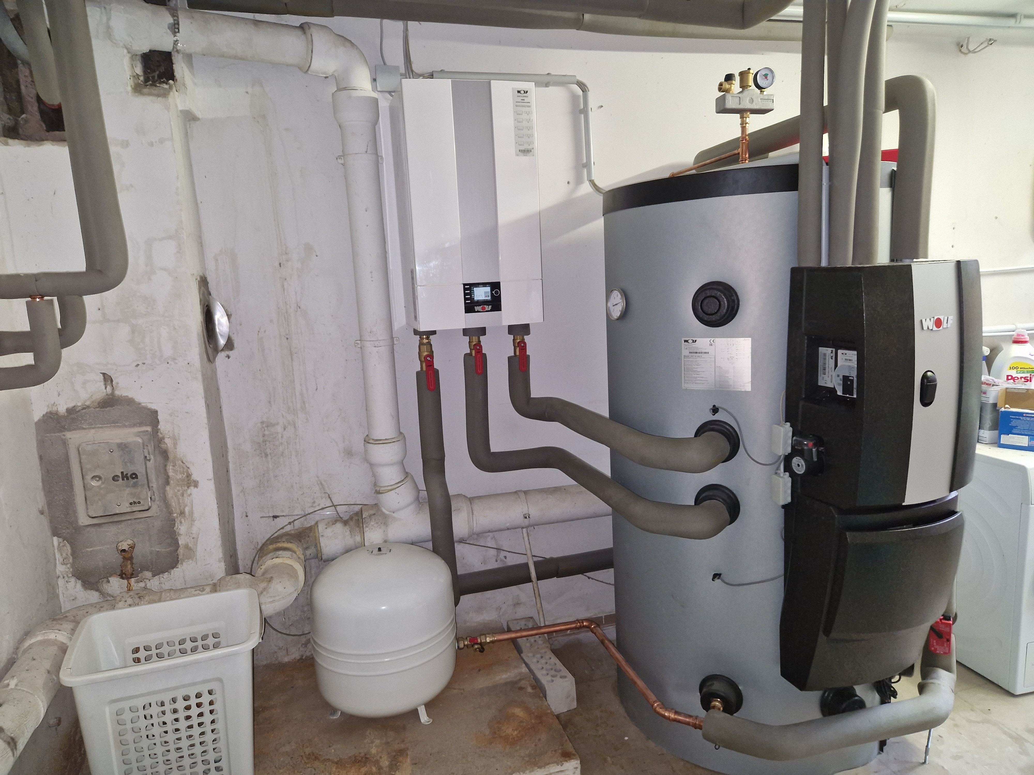 Es wurde ein Wolf Gasbrennwertgerät CGB 2-24 mit Warmwasserspeicher 300 Liter montiert. Ein Heizungsverteiler mit hydraulischer Weiche und 2 Wärmemengenzähler. Eine Nachfülleinrichtung gewährleistet, dass die Anlage immer mit VDI-Heizwasser befüllt wird. Die Abgasanlage ist Raumluftunabhängig durch den alten Kamin.